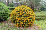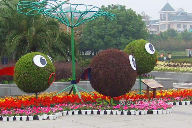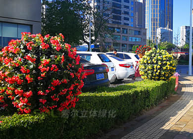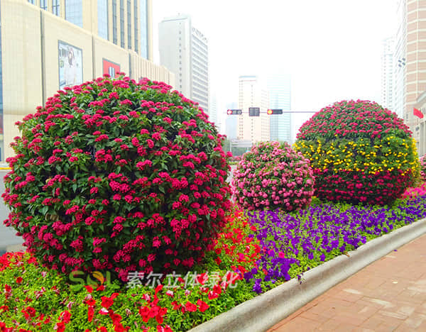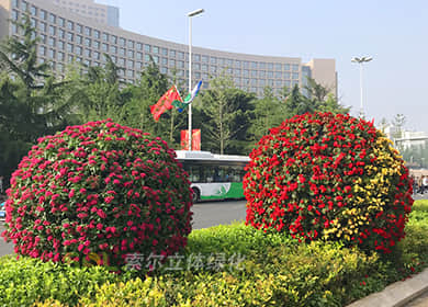 花球既能獨立成景,又可在綠雕中應用,方式多樣。節(jié)日、慶典、會議、活動等重要項目都可運用,用紅色系、橙色系、黃色系等花卉,烘托熱烈氣氛。