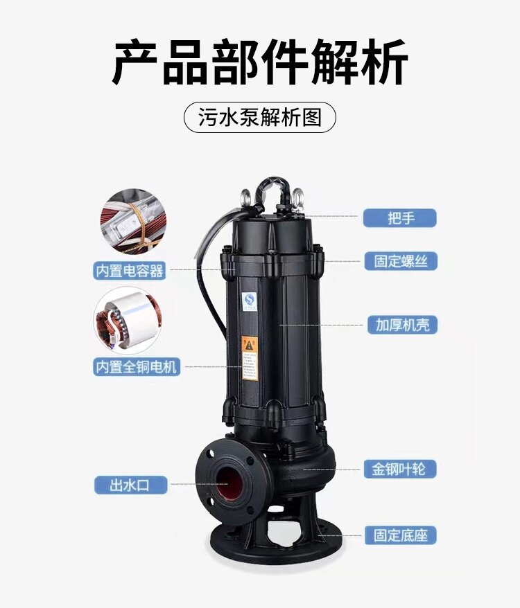 南方WQ_H房建專用污水污物潛水電泵由電機與泵兩部分組成,兩者通過油室及機械密封組件隔開,分固定式自動耦合安裝和移動安裝。